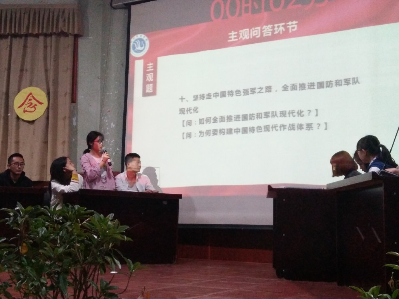 经过初赛的选拔,来自化工公司2017级的五支代表队进入了决赛。比赛分为必答、选答和主观问答三个环节,围绕着十九大报告、习近平新时代中国特色社会主义思想、五四运动等内容展开。必答题中选择题和判断题由五个组轮流作答,而选答题和主观问答题根据当前总分高低来排列作答顺序,依次选择关于军事、环境、民生等七个方面的题型。主观问答,则由评委根据选手表现进行打分。比赛中,参赛选手沉着应对、密切配合,分秒必争,以饱满的精神状态,积极踊跃的回答每一道题,展现出了昂扬的斗志。比赛在主观问题环节达到了高潮。面对开放式的问题,在短的时间内,选手们周密思考,充分讨论,结合党的理论知识和对国家、社会、生活的感悟,认真作答,赢得了观众阵阵掌声。最终,经过紧张激烈的角逐,来自2017级4班的第四组代表队以206的高分获得了本次知识竞赛的第一名。
