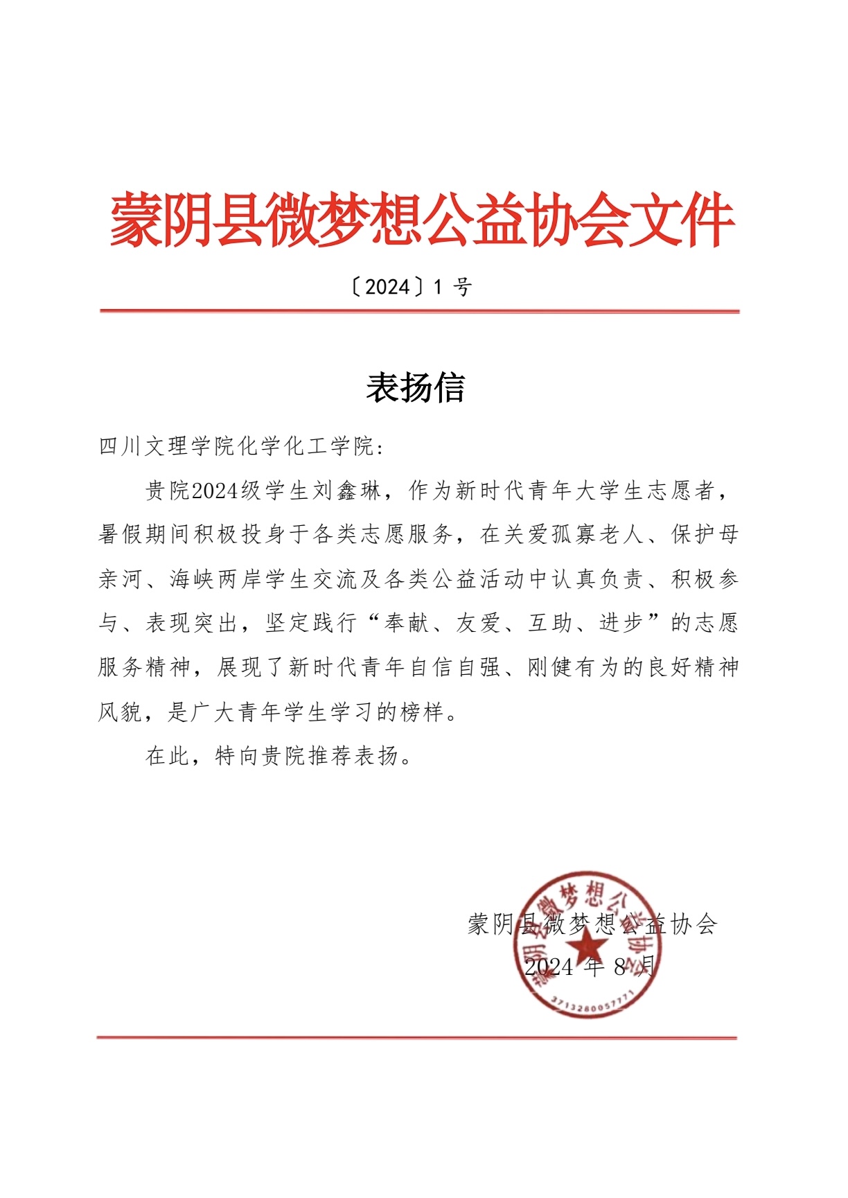 2024级员工刘鑫琳获蒙阴县微梦根公益协会表扬信