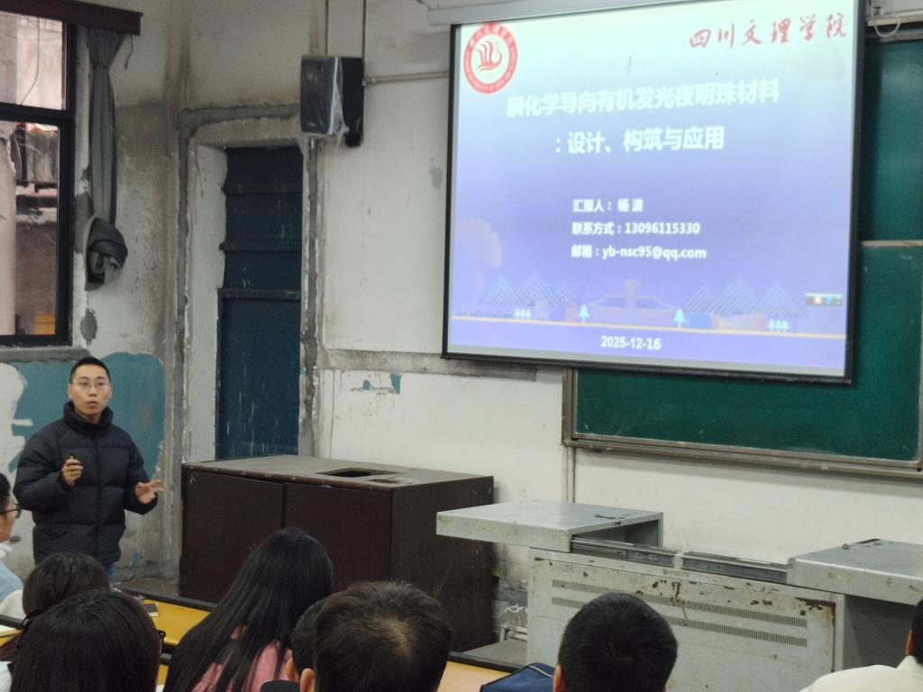 座谈会伊始,杨波博士围绕膦化学导向的有机发光夜明珠材料展开,系统讲解了材料的设计原理、构筑方法及实际应用场景。他结合自身研究经验,深入浅出地剖析了膦化学在优化材料发光性能中的核心作用,介绍了材料在显示技术和环境监测等领域的潜在应用价值,让同学们对有机发光材料的研发与应用有了全面认识。