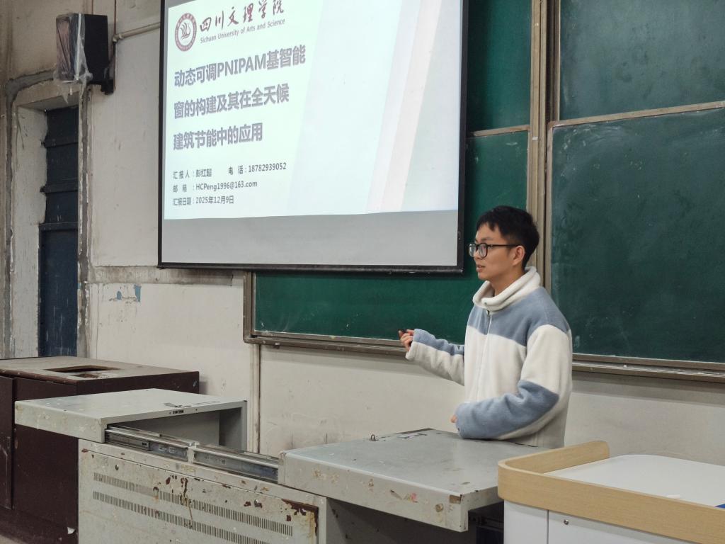 为推广PNIPAM基智能窗的前沿研究内容,激发师生对跨学科科研与产业结合的探索兴趣,2025年12月9日,永利3044集团官网于南坝校区“一站式”戛云社区开展主题为“动态可调PNIPAM基智能窗的构建及其在全天候建筑节能中的应用”座谈会。本次座谈会由彭红超博士担任主讲,50余名师生参与本次座谈会.
