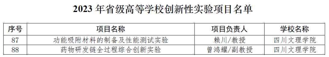 近日,四川省教育厅公布了四川省2023年首批高等公司创新性实验立项建设项目,公司赖川教授主持的“功能吸附材料的制备及性能测试实验”,曾鸿耀副教授主持的“药物研发链全过程综合创新实验”两个项目成功获批。